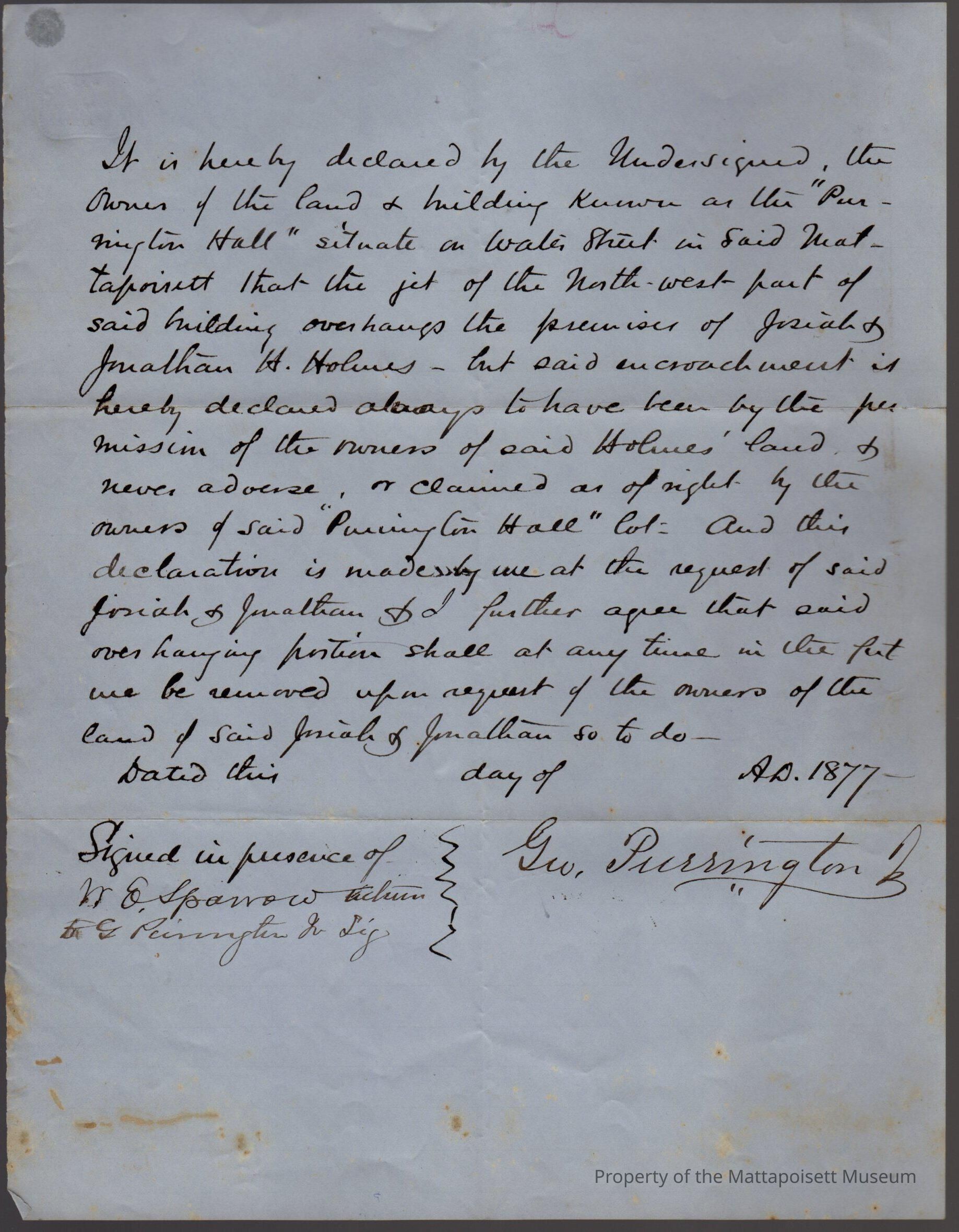 Declaration of the owners of "Purrington Hall" on Water Street that the [jet] of the north-west part of the building overhangs the premises of Josiah & Jonathan H. Holmes, but that said encroachment is declared to be by permission of the owners of said Holmes' land.Collection