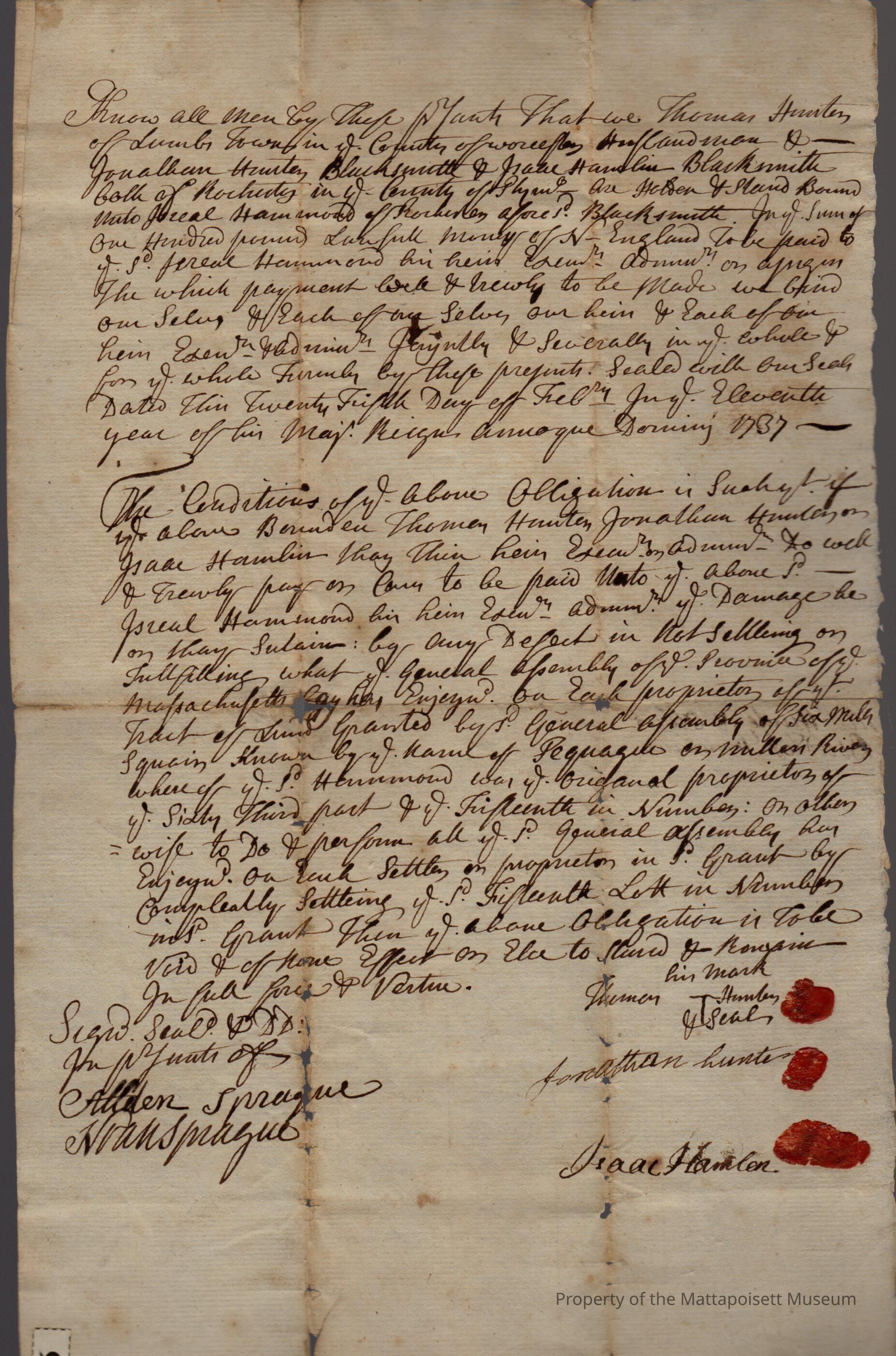 Bond/Obligation, Thomas and Jonathan Hunter and Isaac Hamlin are hoden and bound to Isreal Hammond.Collection