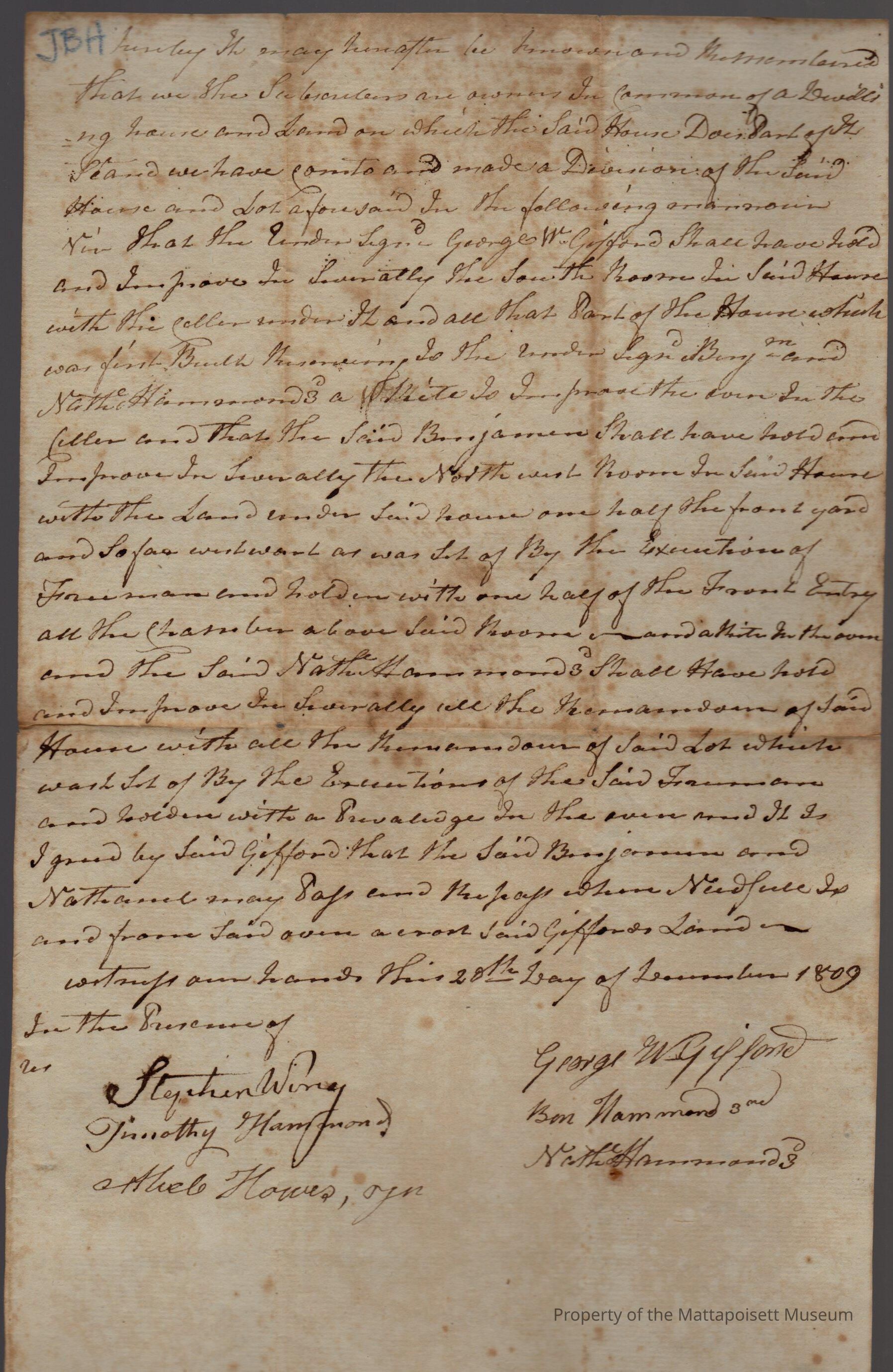 Division of house and land between George W. Gifford, Benjamin Hammond 3rd and Nathaniel Hammond 3rd.Collection