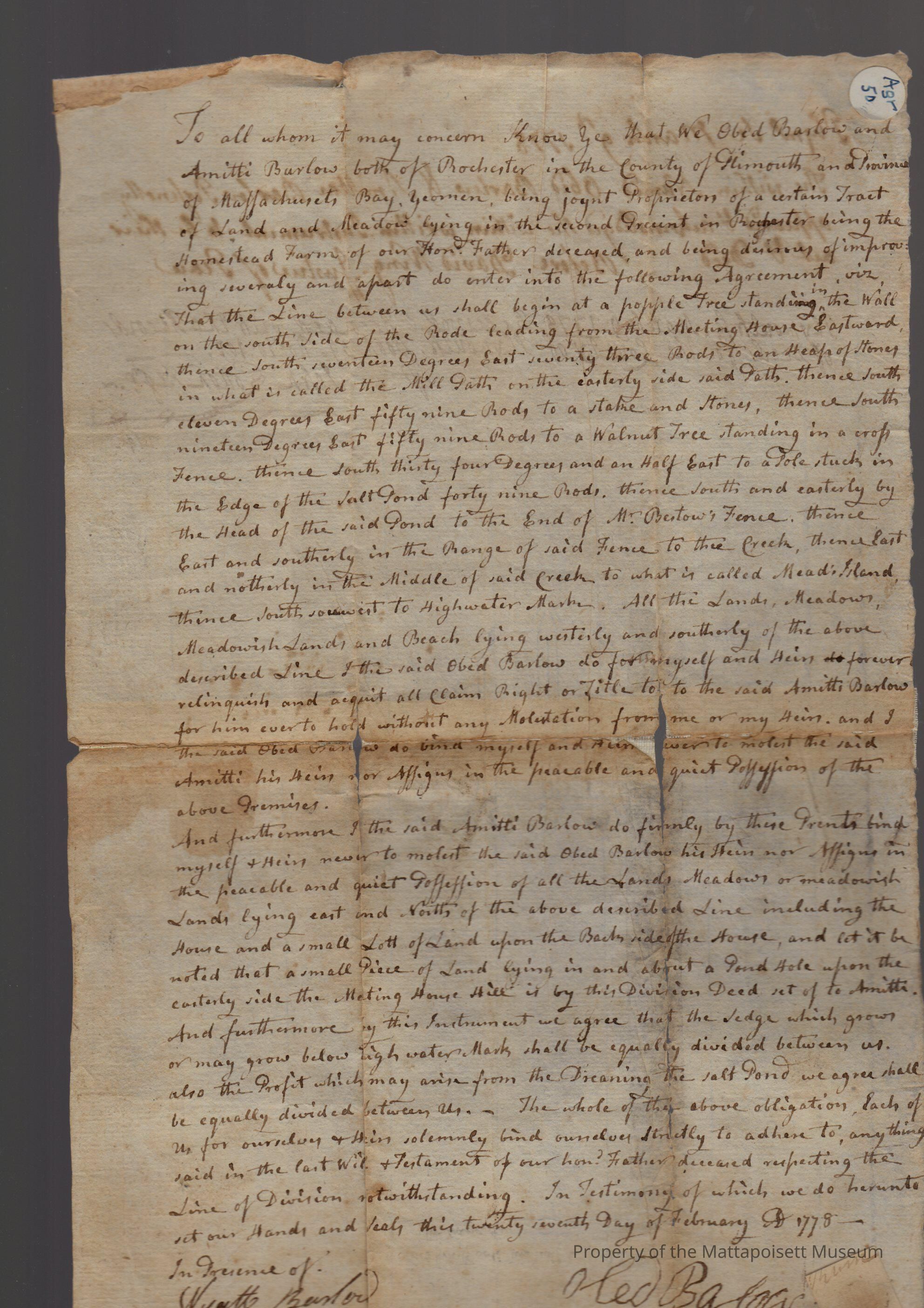 Agreement between Obed Barlow & Amitti Barlow, deed. Note: This division war made [Febzy] and [Arnitty] sold his half to Rev. L. LeB. The same day. Homestead Farm of father.Collection