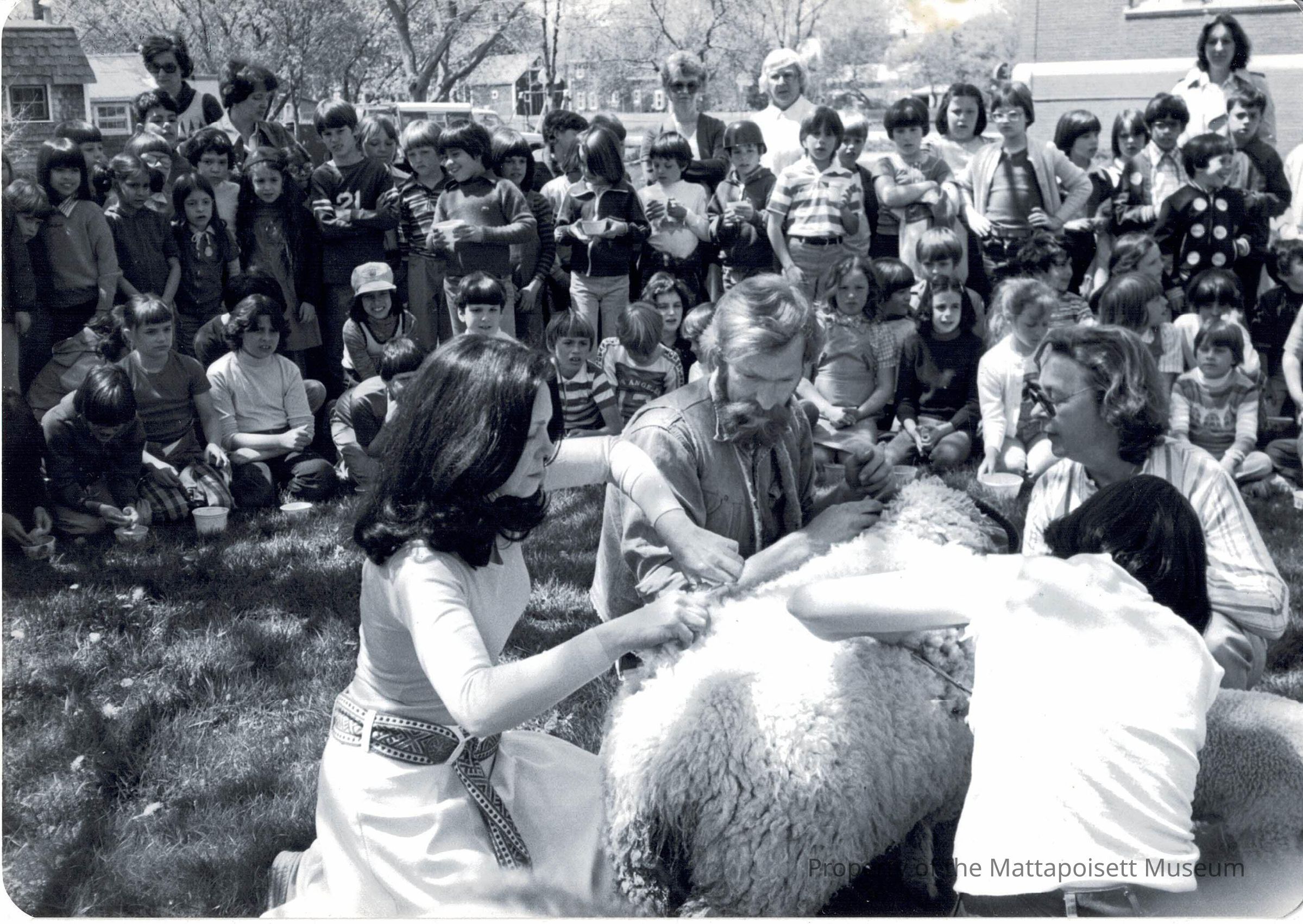 Photograph of a group of school children watching a sheep shearing demonstration. Could be at Center School or Old Hammondtown.Collection