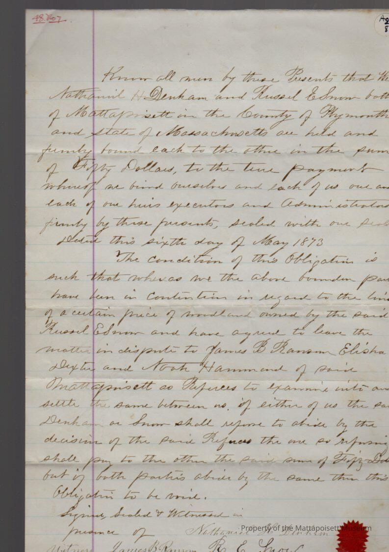 Arbitration binding of Nathaniel H. Denham and Russel E. Snow, settlement over piece of woodland.Collection