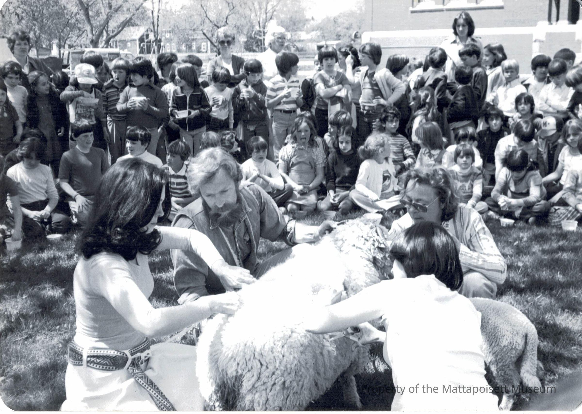 Photograph of a group of school children watching a sheep shearing demonstration. Could be at Center School or Old Hammondtown.Collection