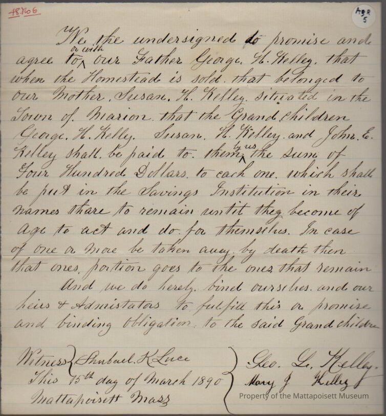 Agreement to pay grandchildren, George H. Kelley, Susan H. Kelley and John E. Kelley when Homestead land of George H. Kelley is sold.Collection