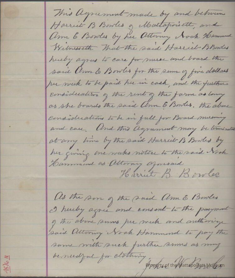 Agreement between Harriet B. Bowles and Ann E. Bowles by her attorney Noah Hammond, for Harriet to care for, nurse and board said Ann for a sum and rent the farm as long as the care exists.Collection