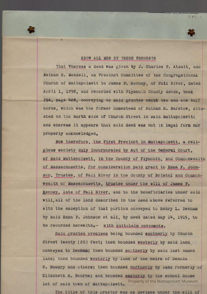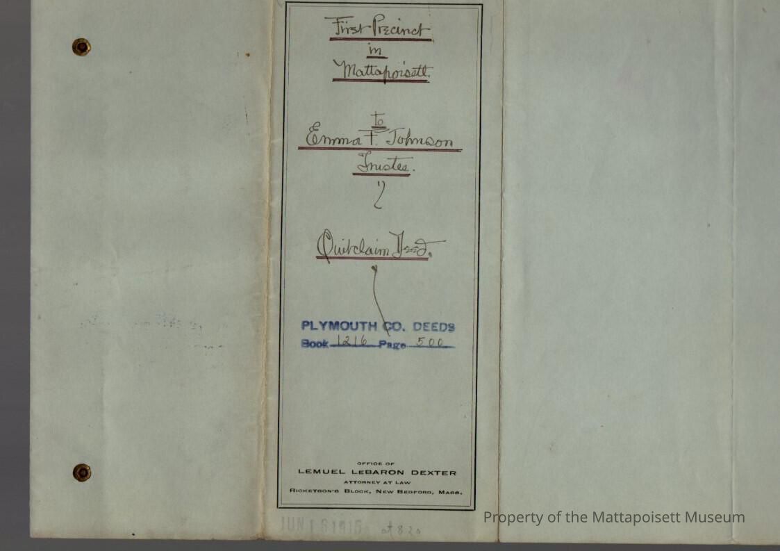 Quitclaim deed, First Precinct in Mattapoisett to Emma F. Johnson, trustee. Book 1216, page 500.Collection