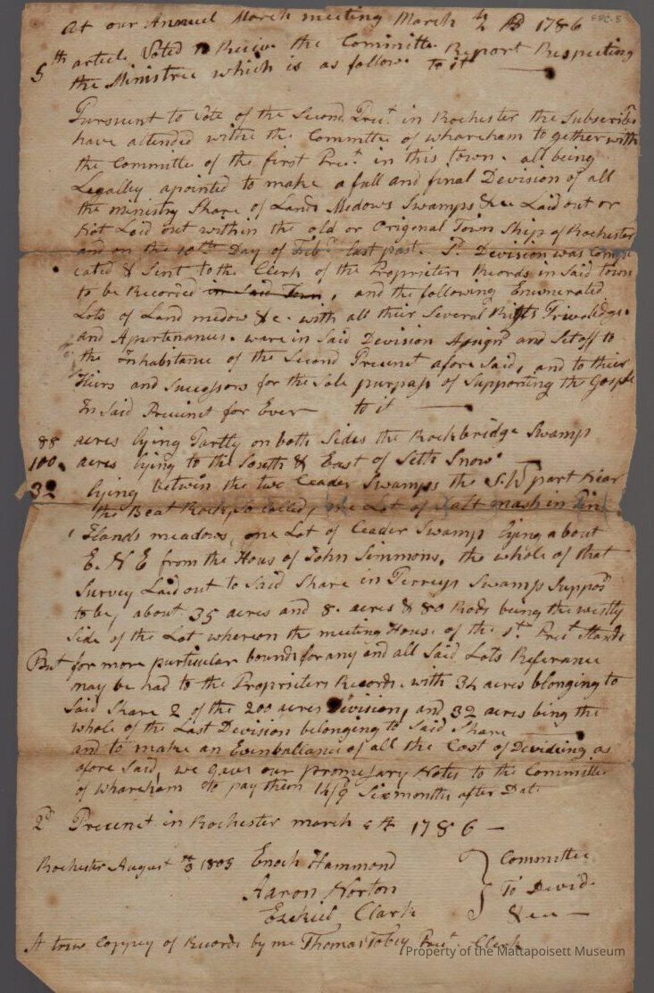 Report of annual march meeting, 5th article voted to [] the committee report of the minister. A True Copy, August 3rd 1805.Collection