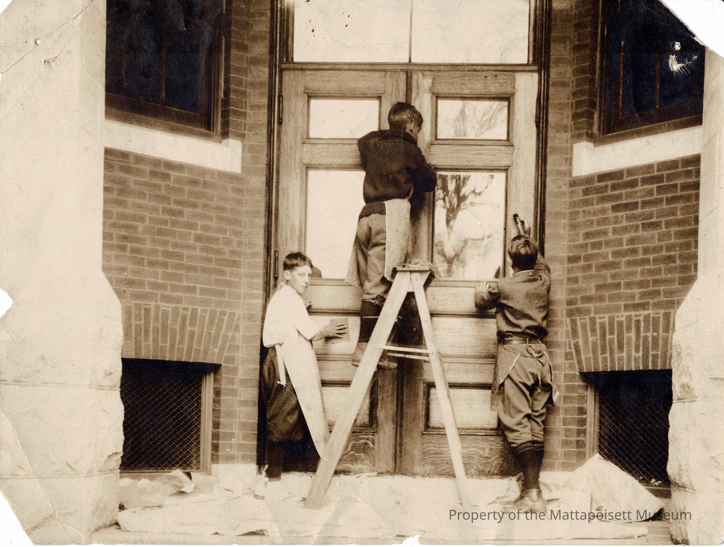 Photograph of a group of boys sanding the Center School door. Boy on left is Alfred Vaughn.Collection