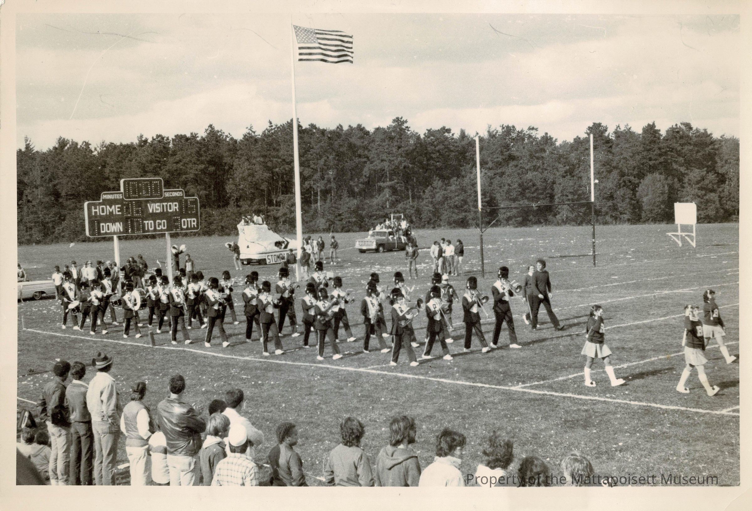 Photograph of the Old Rochester Regional High School marching band on the football field.Collection