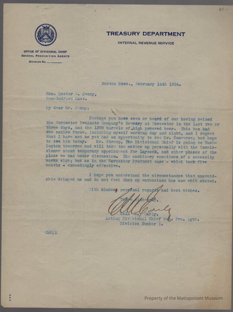 Letter to Lester W. Jenney from Cola M. Early, Acting Divisional Chief, General Prohibition Agents, Division Number 1.Collection