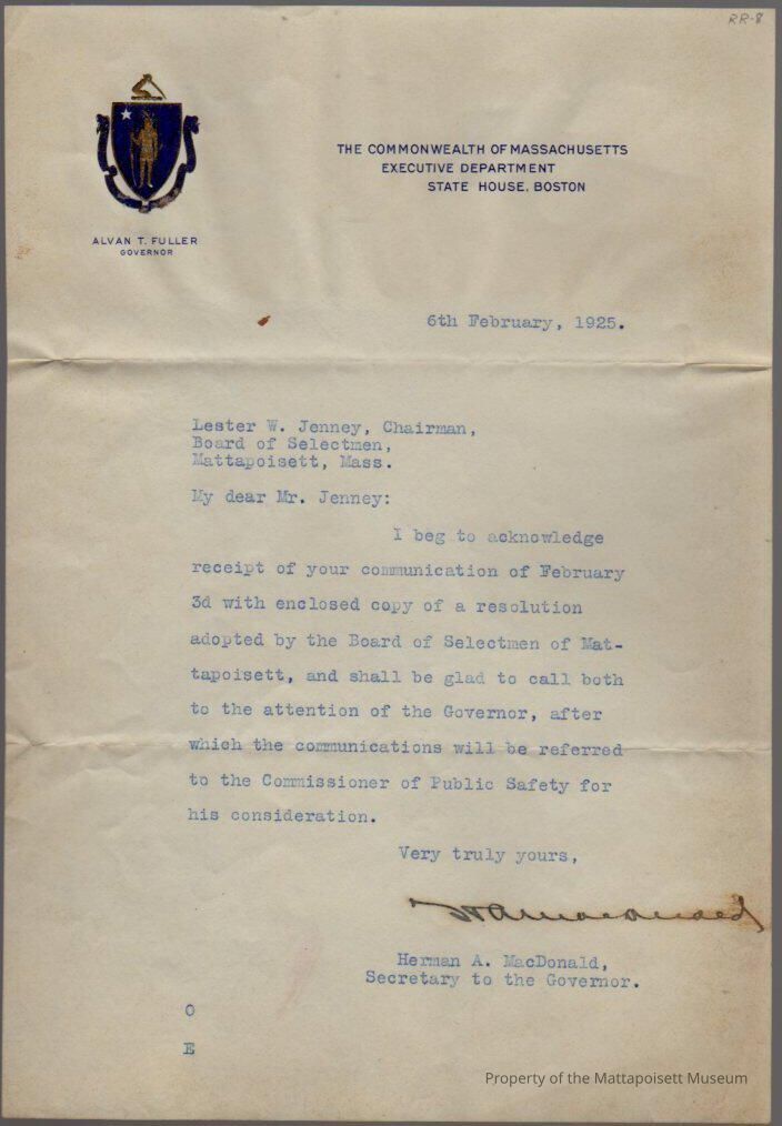 Letter to Lester W. Jenney from Herman A. MacDonald, Secretary to the Governor.Collection