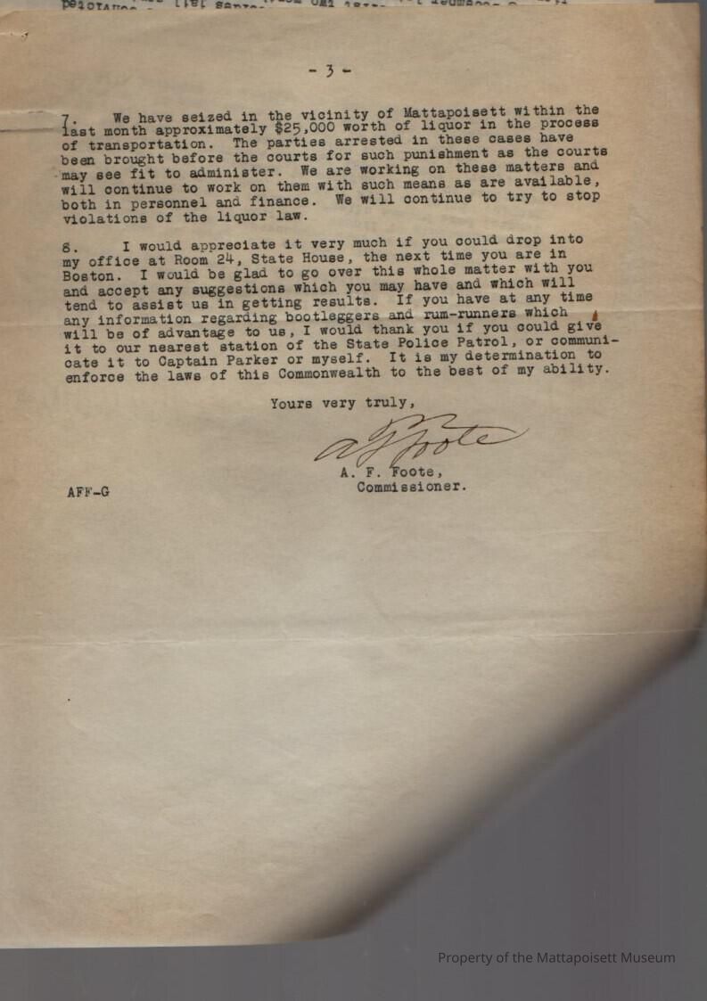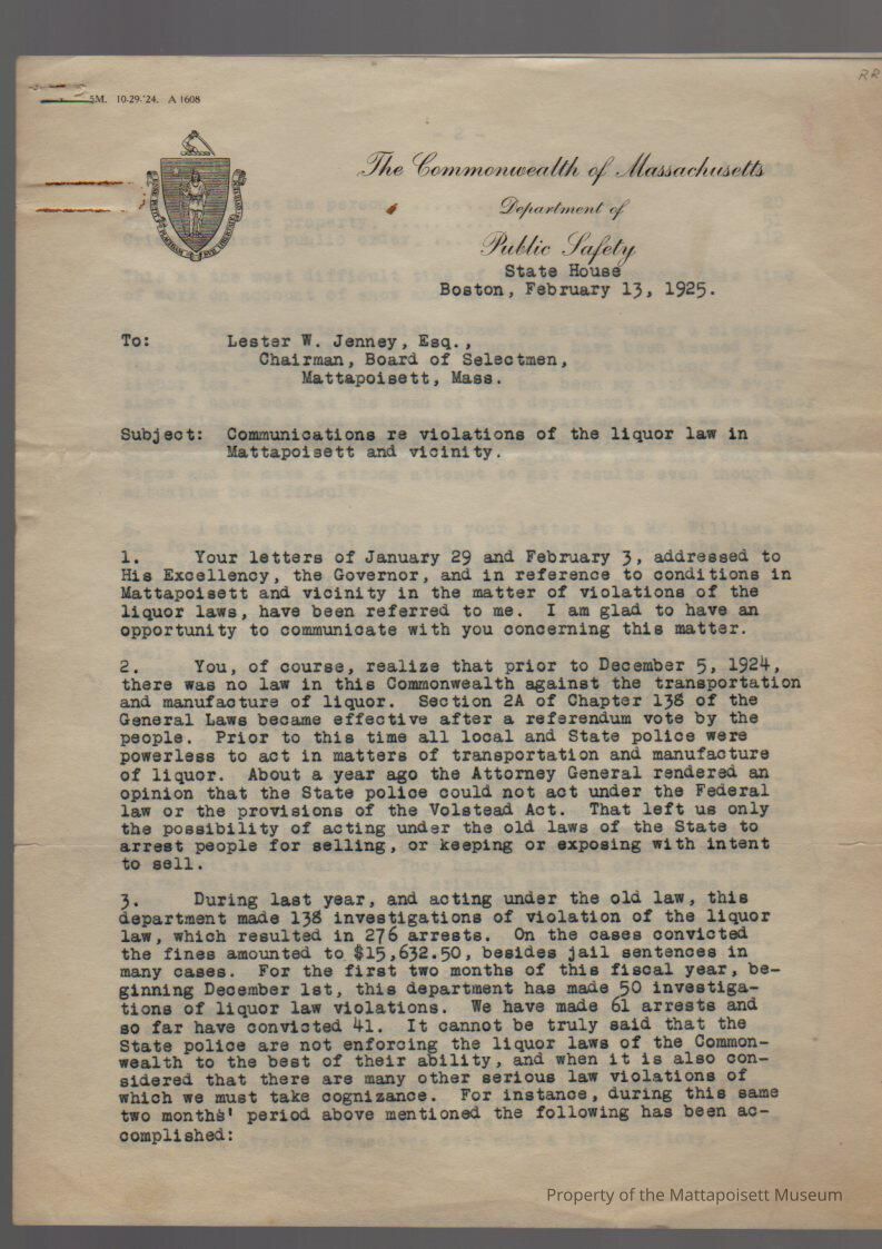 Letter to Lester W. Jenney from A. F. Foote, Commissioner, Department of Public Safety, State House. Communications re violations of the liquor law in Mattapoisett and vicinity.Collection