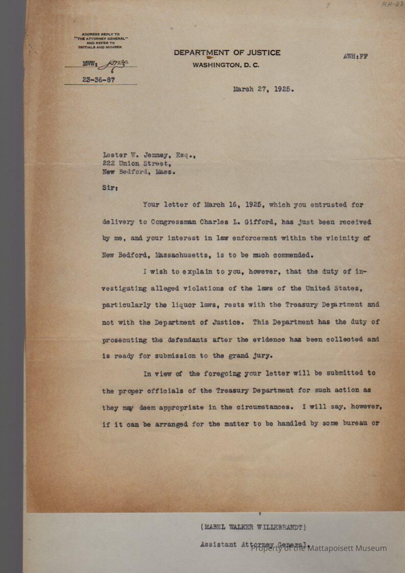Letter to Lester W. Jenney from Mabel Walker Willebrandt, Assistant Attorney General.Collection