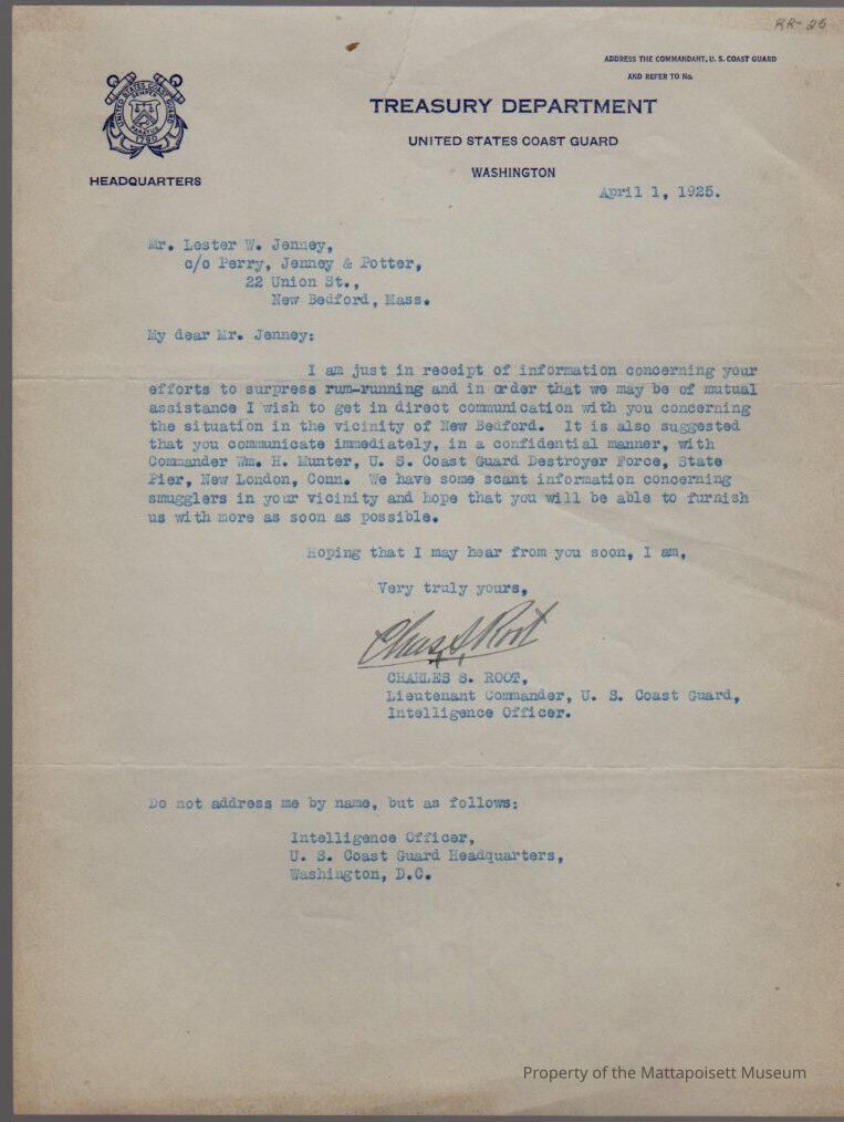 Letter to Lester W. Jenney from Charles S. Root, Lieutenant Commander, U. S. Coast Guard, Intelligence Officer.Collection