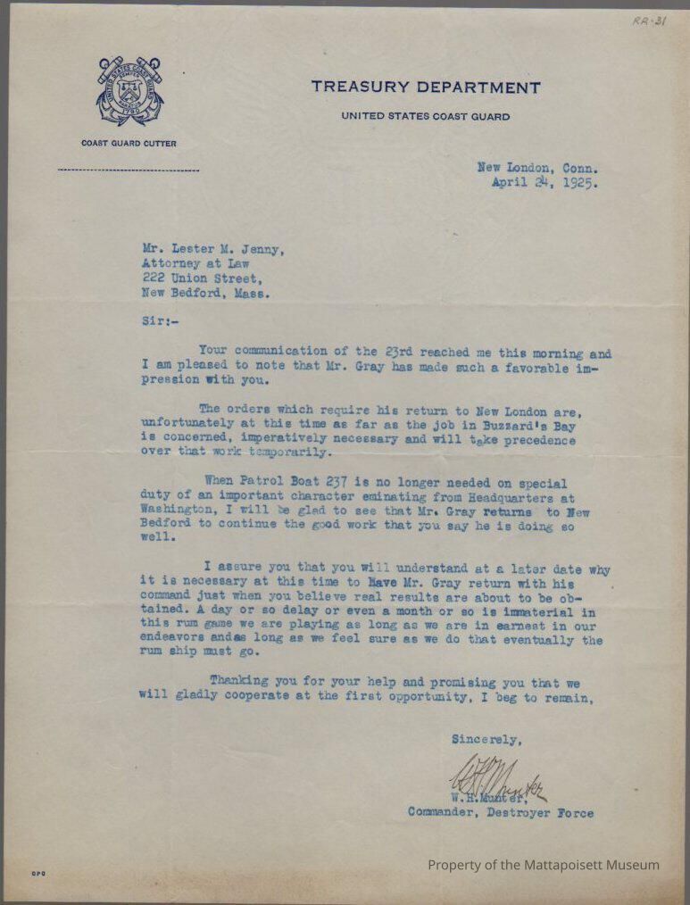 Letter to Lester W. Jenney from W. H. Munter, Commander, Destroyer Force, U. S. Coast Guard.Collection