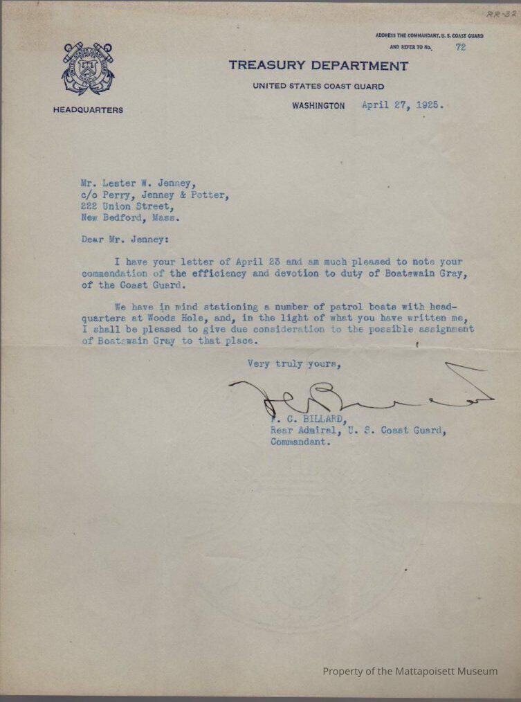 Letter to Lester W. Jenney from F. C. Billard, Rear Admiral, U. S. Coast Guard, Commandant.Collection