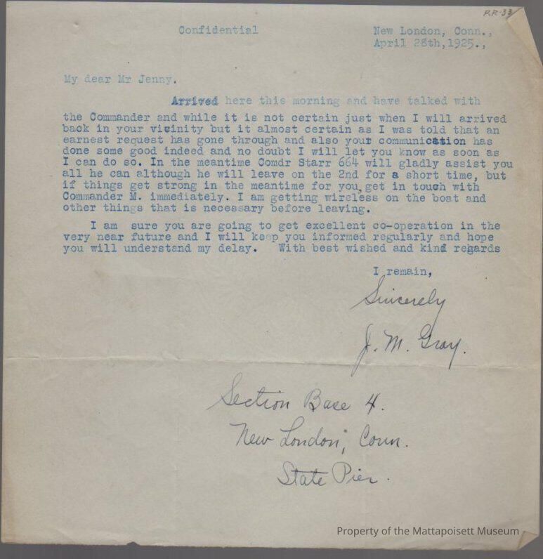 Letter to Lester W. Jenney from J. M. Gray, Section Base 4, New London, Conn. State Pier.Collection