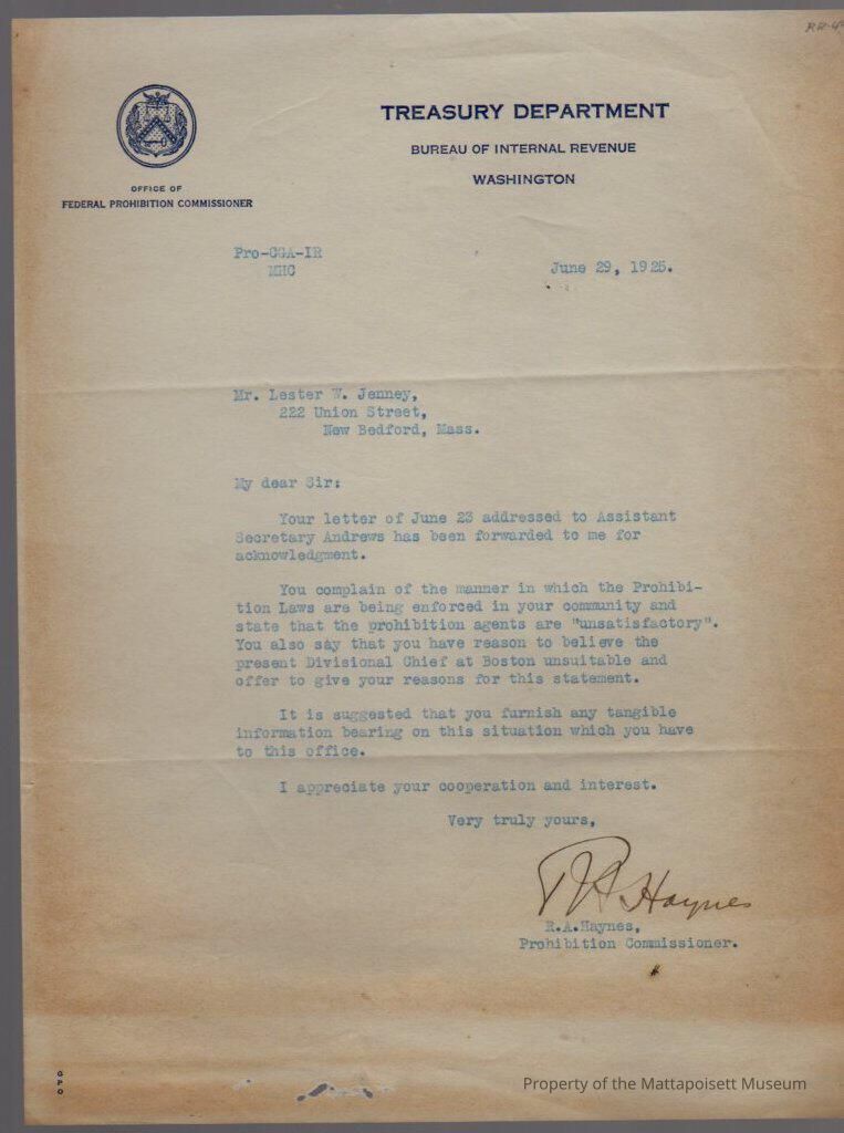 Letter to Lester W. Jenney from R. A. Haynes, Prohibition Commissioner.Collection
