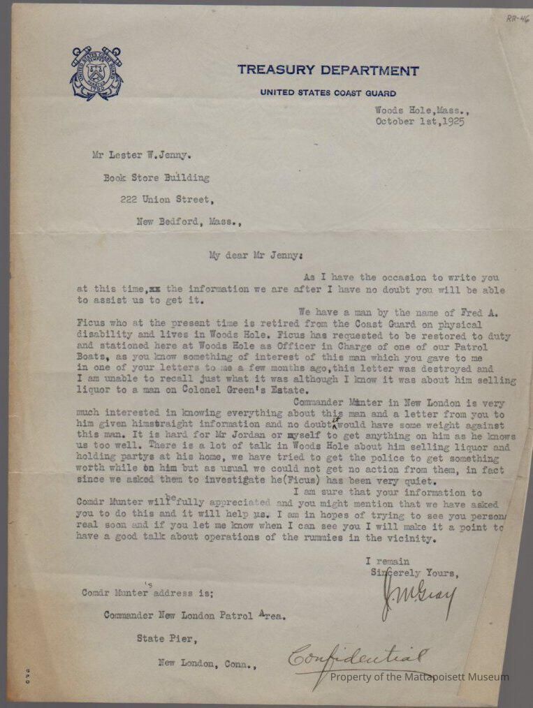 Letter to Lester W. Jenney from J. M. Gray, Section Base 4, New London, Conn. State Pier.Collection