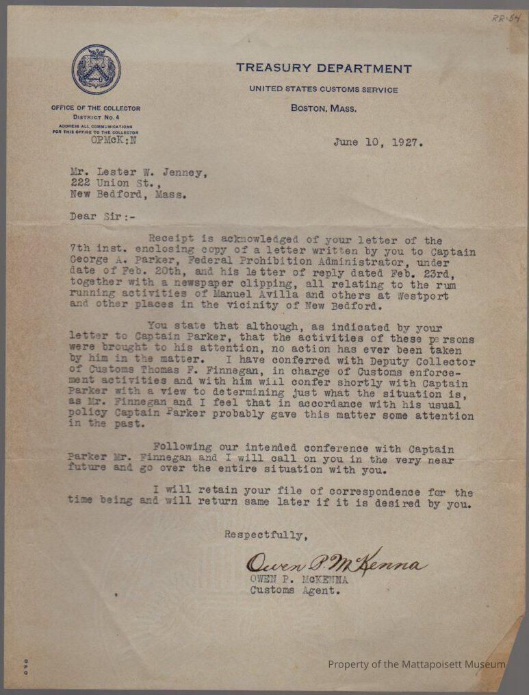 Letter to Lester W. Jenney from Owen P. McKenna, Customs Agent, Office of the Collector, District No. 4.Collection