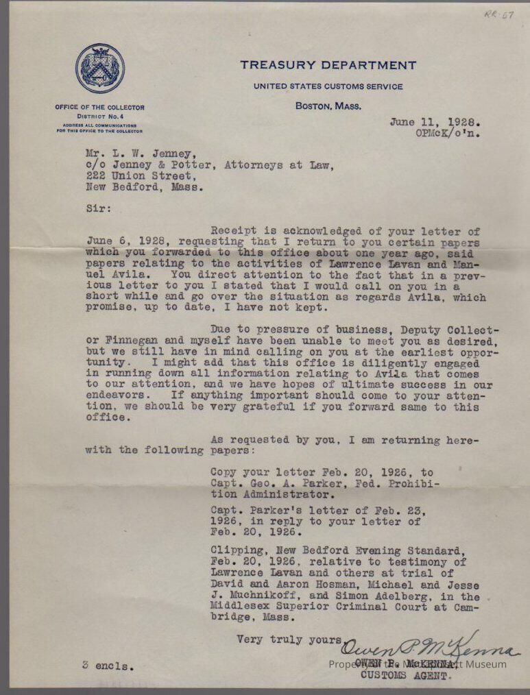 Letter to Lester W. Jenney from Owen P. McKenna, Customs Agent, Office of the Collector, District No. 4.Collection
