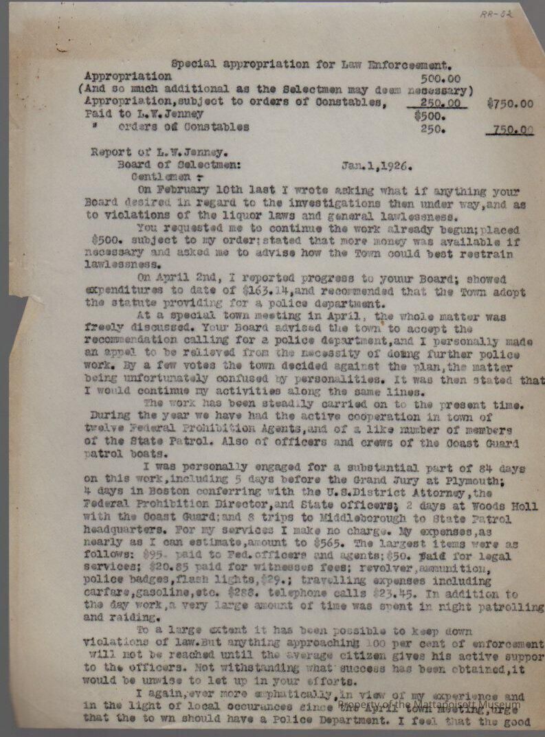 Special appropriation for Law Enforcement, Report of Lester W. Jenney.Collection