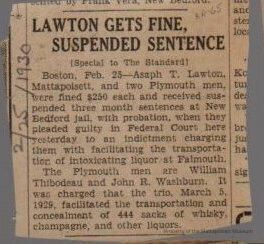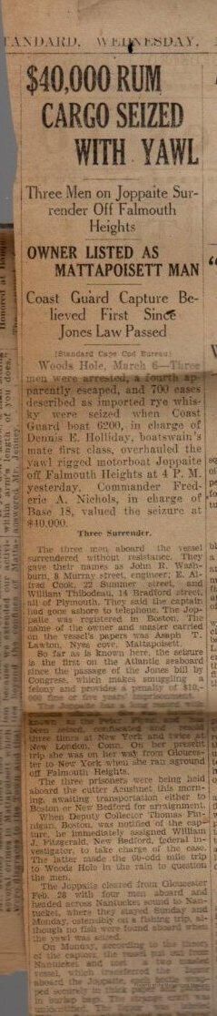 Newspaper articles "Lawton gets fine, suspended sentence" and "$40,000 rum cargo seized with yawl" Three men on Jippaite surrender off Falmouth Heights. Owner listed as Mattapoisett Man. Coast Guard capture believed first since Jones Law passed.Collection