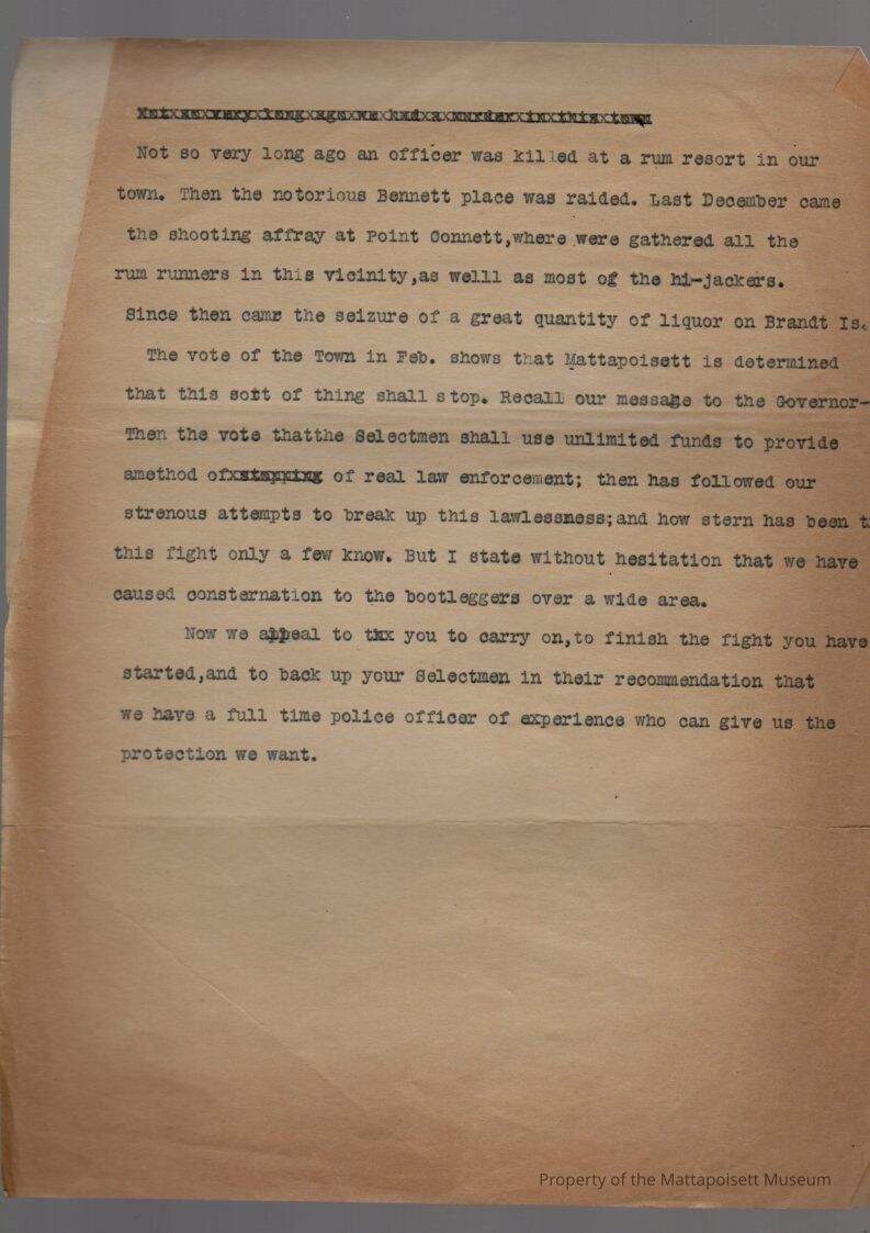 Transcription of article, rum resort, notorious "Bennett" place, Point Connett, rum-runners & hi-jackers.Collection