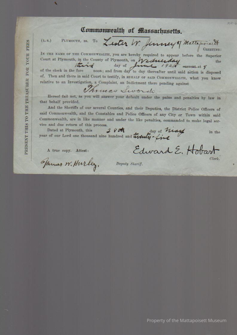 Summons to Lester W. Jenney to testify on behalf of Commonwealth of Massachusetts in case against Thomas Swords.Collection