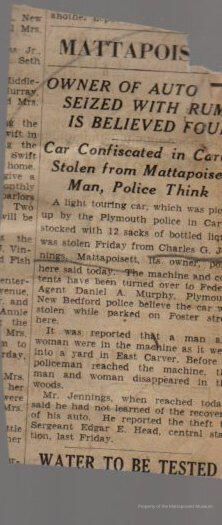 Newspaper article "Owner of auto seized with rum is believed foul. Car confiscated in Carver stolen from Mattapoisett man (Charles G. Jennings), police think.Collection