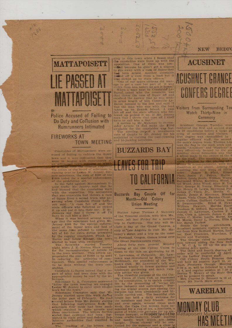 Newspaper article "Lie passed at Mattapoisett", Police accused of failing to do duty and collusion with rumrunners intimated. Fireworks at Town Meeting.Collection