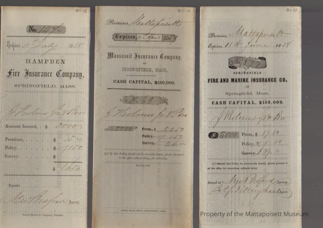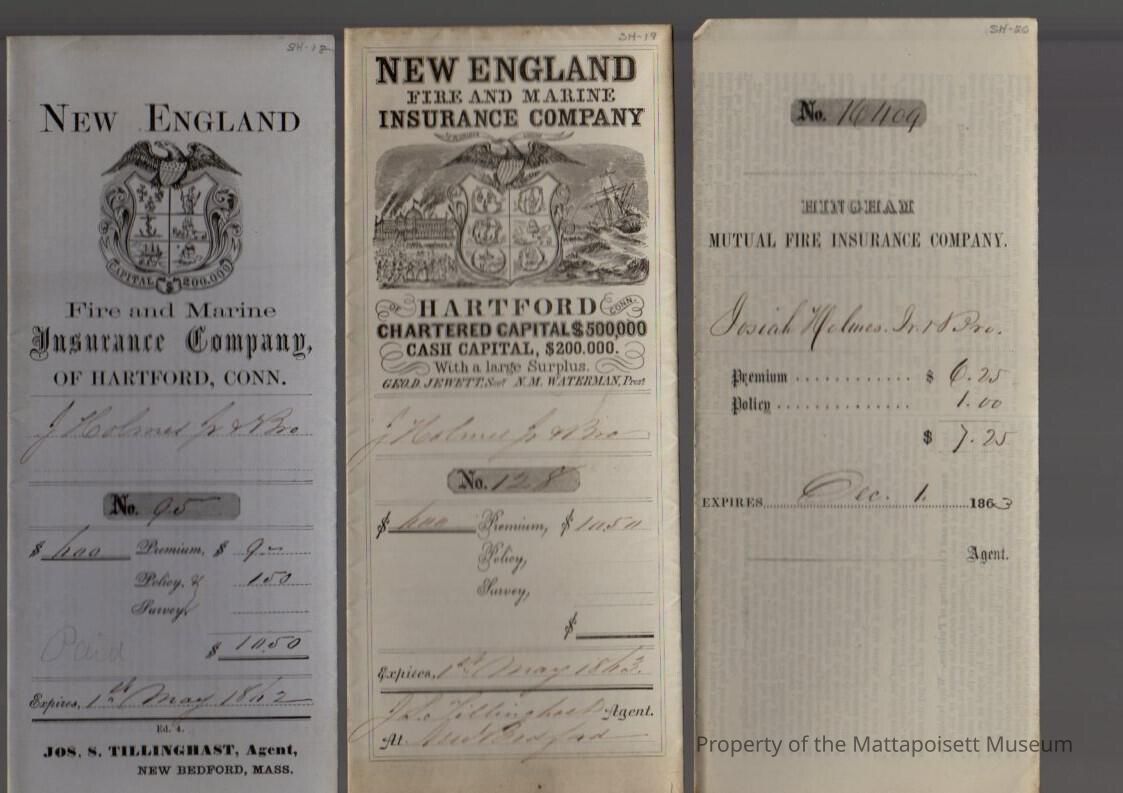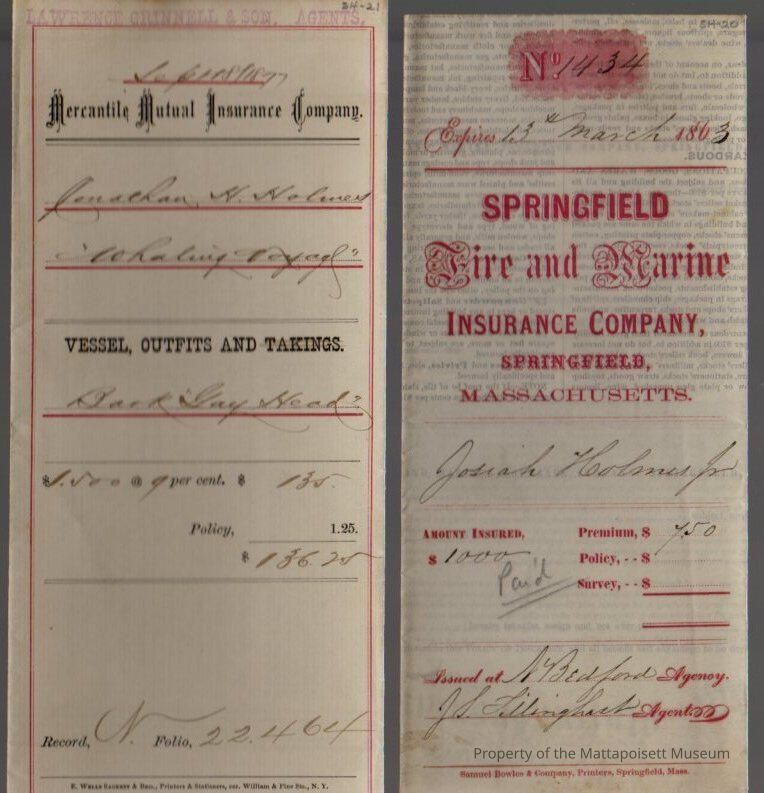 Insurance binders for Jonathan H. Holmes Jr. & Bro. Josiah Holmes. Bark Gay Head.Collection