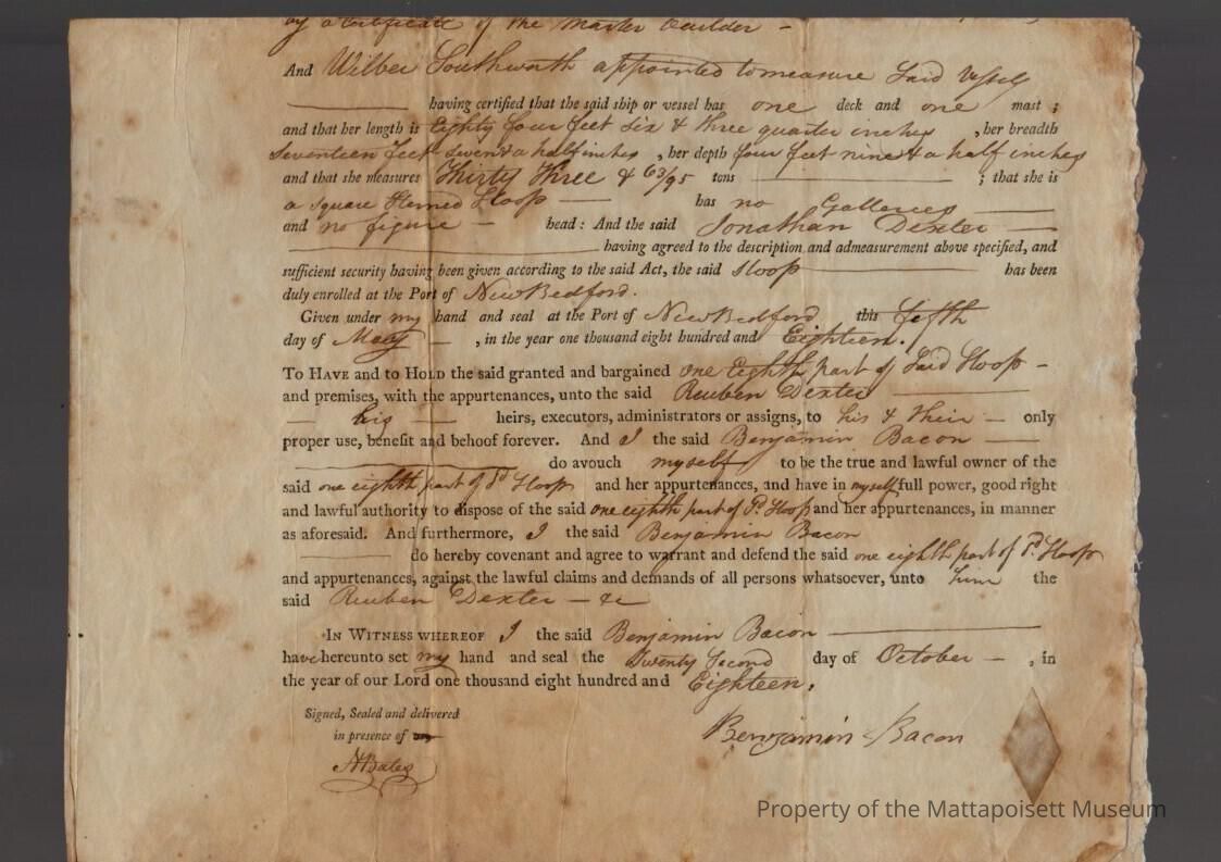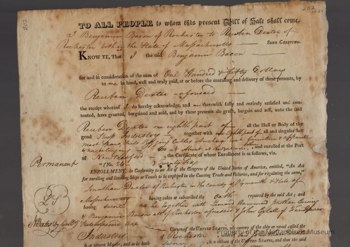Sale of 1/8 of Sloop Industry from Benjamin Bacon to Reuben Dexter.Collection