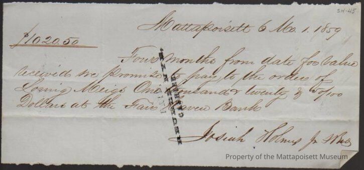 Receipt for four months from date for value received, promise to pay to the order of Loring Meigs at the Fairhaven Bank, Josiah Holmes Jr. & Bro.Collection