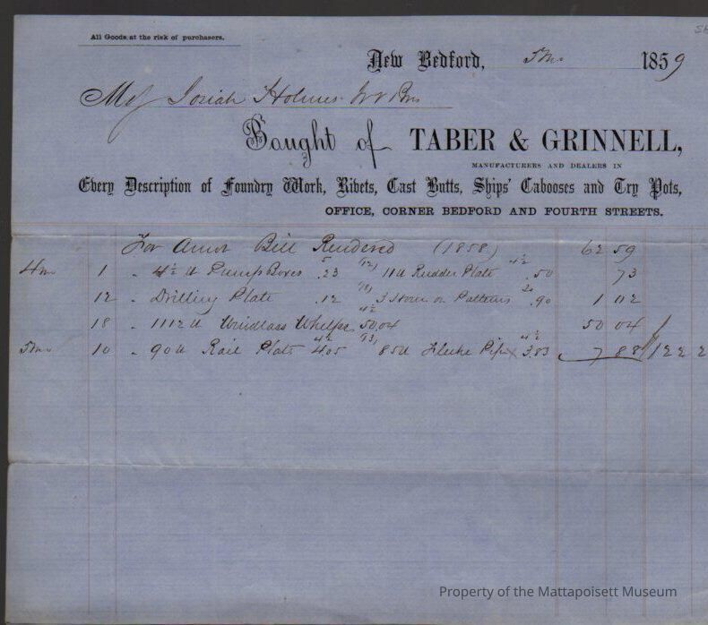 Receipt Josiah Holmes Jr. & Bro, bought of Taber & Grinnell.Collection
