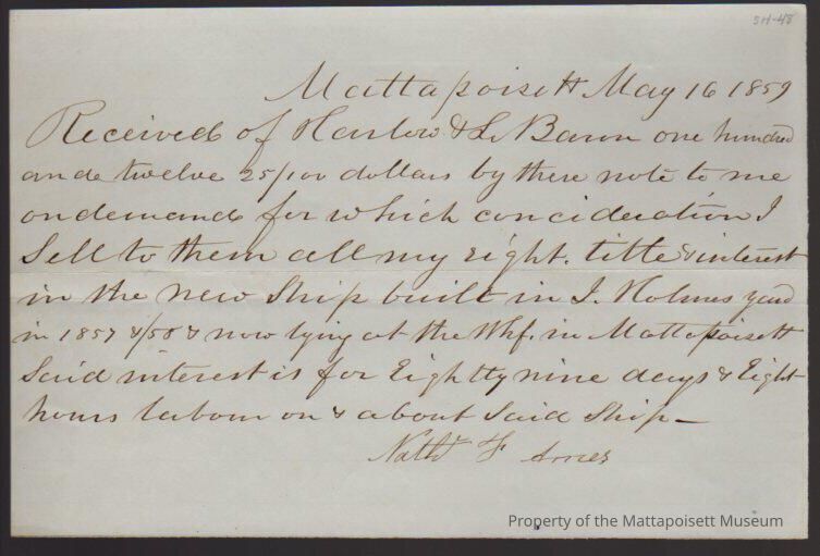 Received of Harlow & LeBaron payment to Nathaniel F. Ames to sell rights, title & interest in the new ship built in J. Holmes yards in 1857-1858.Collection