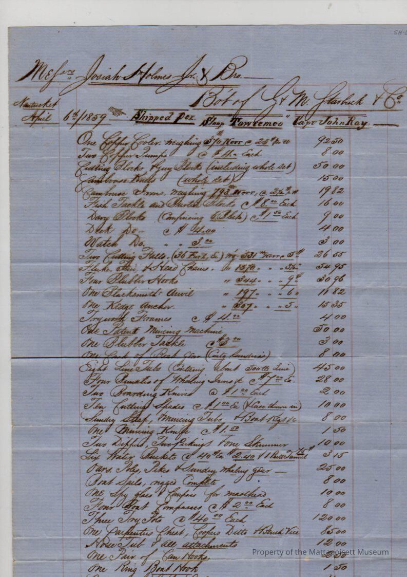 Accounting list Messrs Josiah Holmes Jr. & Bros. Bought of G. & M. Starbuck & Co. Shipped per Sloop Tawtemeo, Capt. John Ray.Collection