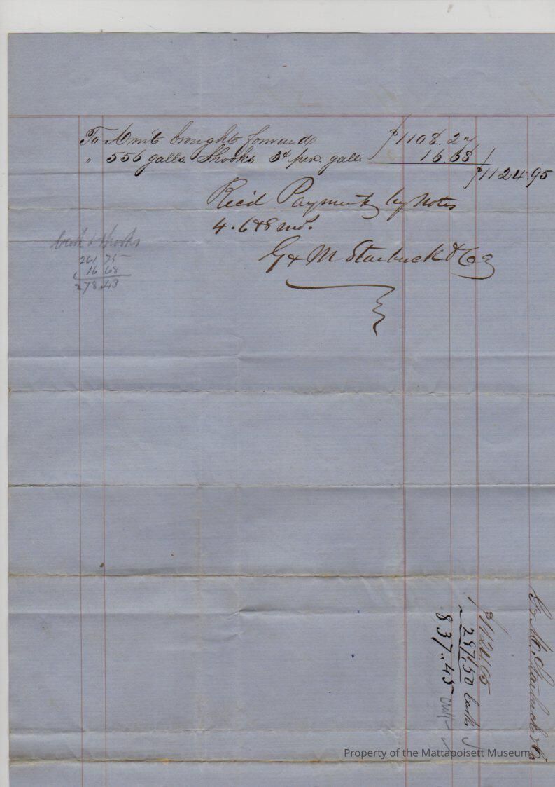 Recieved payment by notes by G. & M. Starbuck & Co., amount brought forward for 556 galls shooks.Collection