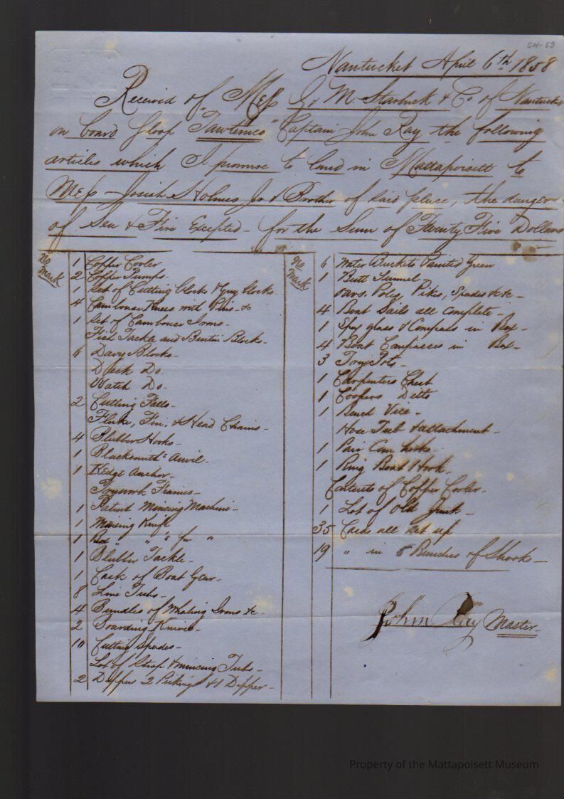 Received of G. & M. Starbuck & Co. of Nantucket on board Sloop Tawtemeo, Capt. John Ray the following articles which is promised to land in Mattapoisett to Messrs. Josiah Holmes Jr. & Bros.Collection