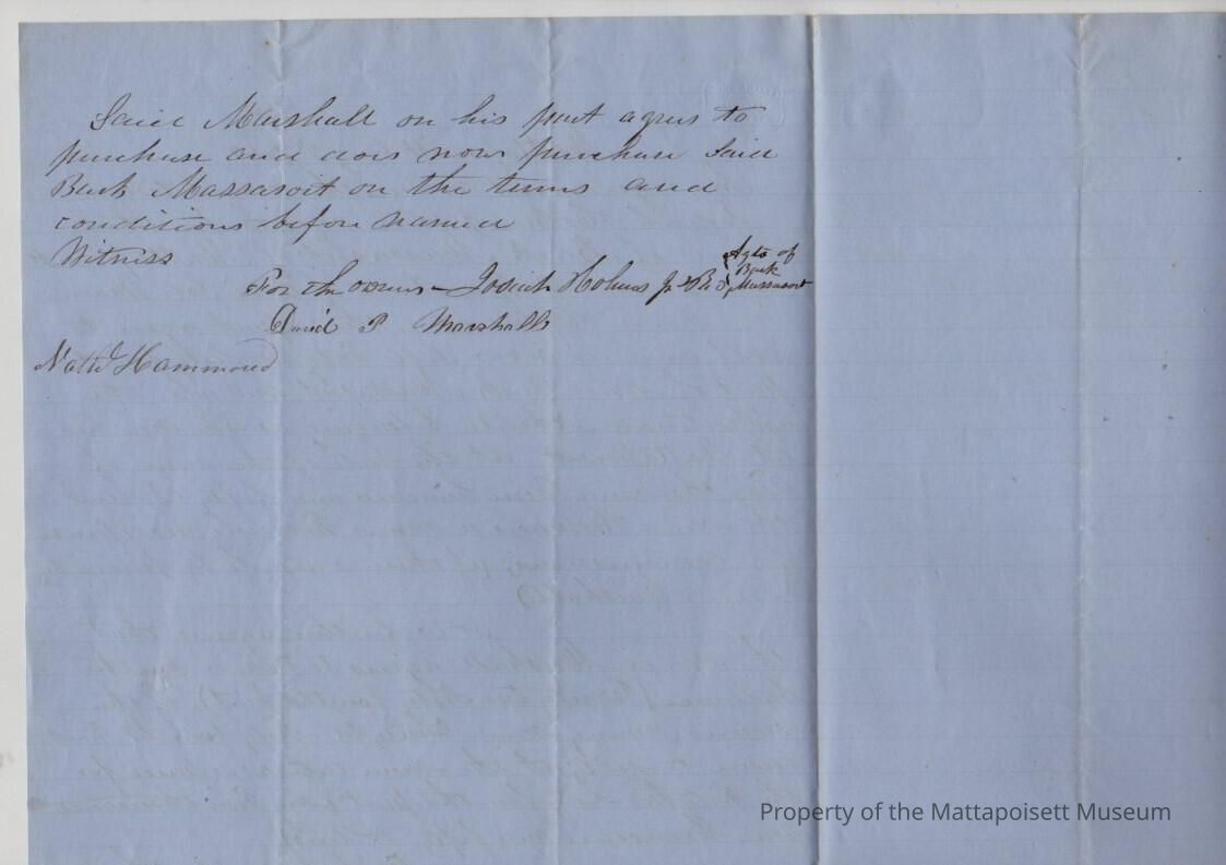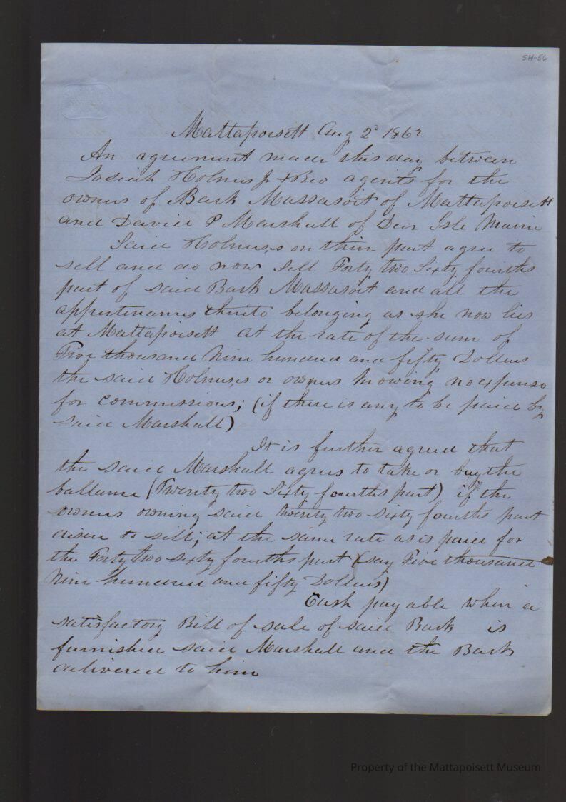 Agreement between Josiah Holmes Jr. & Bros., agents for the owners of Bark Massasoit and David P. Marshall for 42/64 of Bark Massasoit.Collection