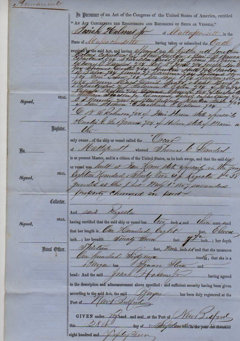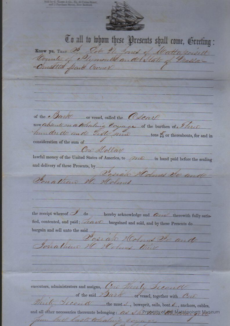 Bill of sale for 1/32 of Bark Oscar, Lot N. Jones to Josiah Holmes Jr. And Jonathan H. HolmesCollection