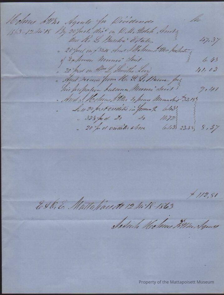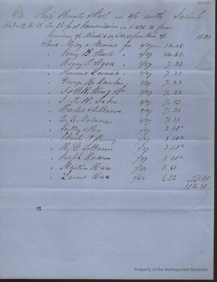 Accounting of Ship Brewster in account with Josiah Holmes Jr. & Bros, agents for dividends.Collection