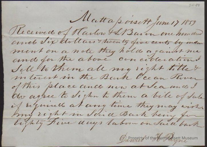 Received of Harlow & LeBaron $106.25 on note held against Daniel H. Payne, sell to them right title & interest in the Bark Ocean Rover.Collection