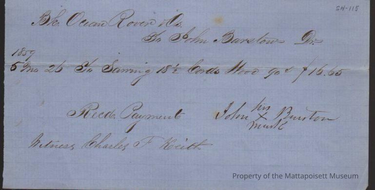 Receipt for Bark Ocean Rover & Owners to John Barstow for sawing cords of woodCollection