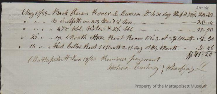 Receipt for Bark Ocean Rover & Owners to Joshua Cushing for barrels of water, rent for room.Collection