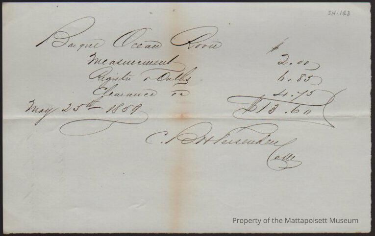 Receipt for Barque Ocean Rover to C. [Herseuhen] & Co. For measurement, registration oath, clearance.Collection