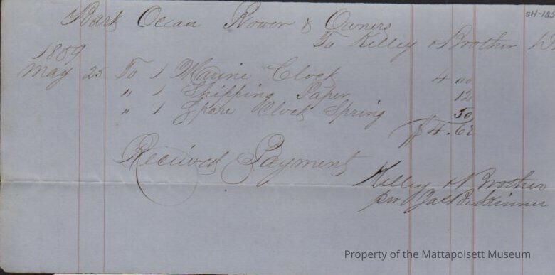 Receipt for Bark Ocean Rover & Owners to Kelley & Brother, per James B. Kinner for marine clock, spare spring, shipping paper.Collection
