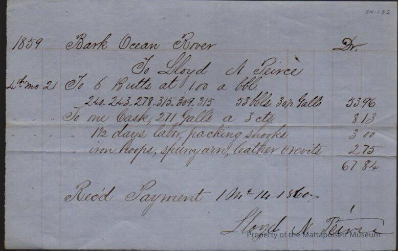 Bark Ocean Rover to Lloyd N. Peirce, labor, packing shooks, iron hoops, spunyarn, leather & revits.Collection