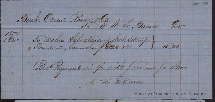 Bark Ocean Rover & owners to E. H. LeBaron, labor raising heel setting, transom, launching. Received in account with J. Holmes Jr. & Bros.Collection