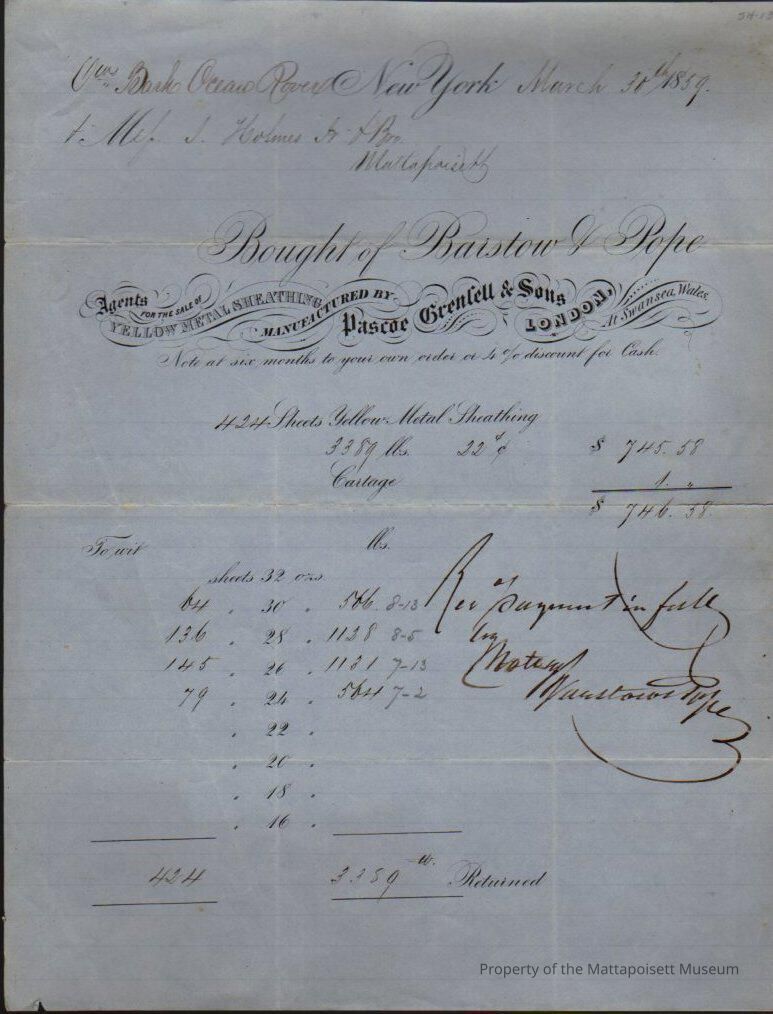 Bark Ocean Rover & Messers. J. Holmes & Bro. Bought of Barstow & Pope, yellow metal sheathing, cartage, payment received.Collection